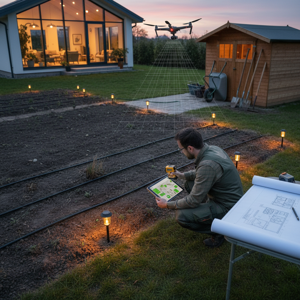 - Zaplanować rozmieszczenie lamp i systemów nawadniania na podstawie analizy terenu.