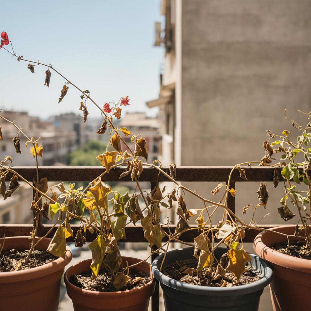 Zwiędnięte rośliny na balkonie po upalnym tygodniu – brak automatycznego podlewania to najczęstszy powód ich śmierci.