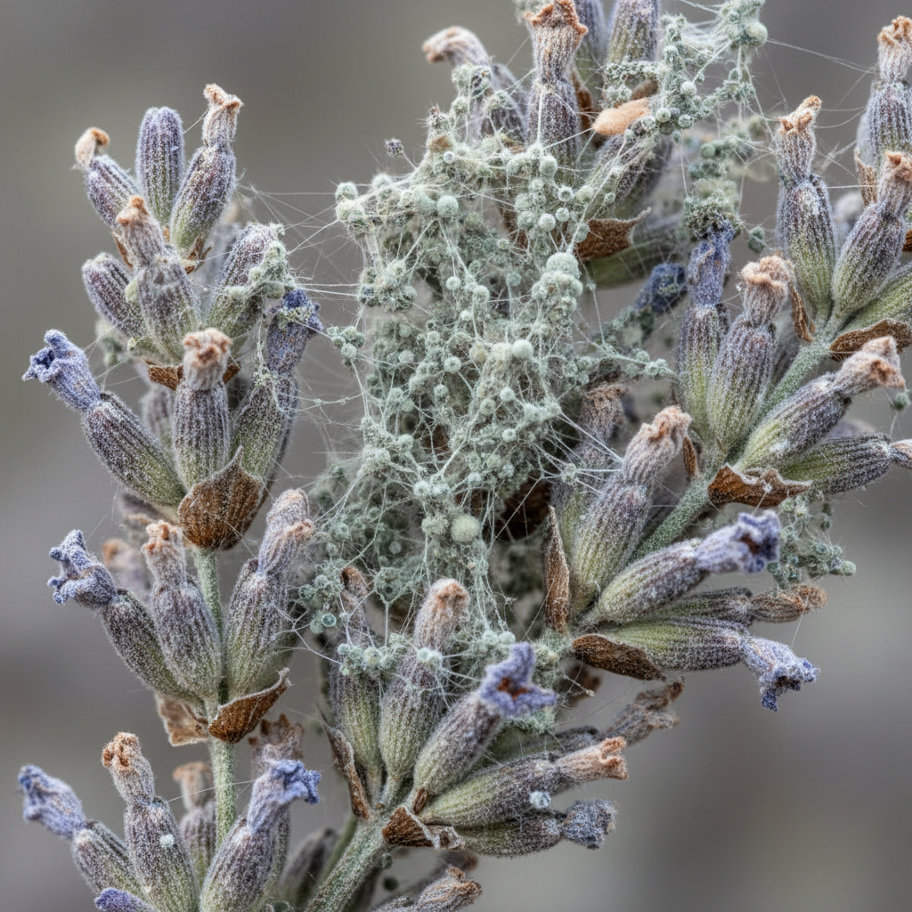 Szara pleśń (Botrytis cinerea) to najgroźniejszy i najbardziej rozpowszechniony wróg lawendy w Polsce. Jej objawy to nie tylko charakterystyczny szary, puszysty nalot na pędach i liściach, ale także nieprzyjemny, ziemisty zapach gnicia. Pędy stają się miękkie i łamliwe, kwiaty gniją zanim zdążą rozkwitnąć, a cała roślina traci wigor.