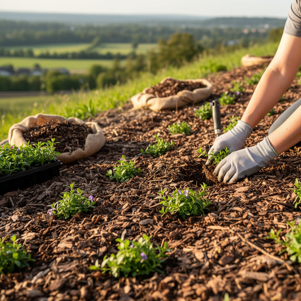 Sadzenie na skarpie rządzi się własnymi prawami. Rośliny muszą być sadzone skośnie – pod kątem nachylenia, by system korzeniowy mógł od razu zacząć stabilizować glebę. Mulcz kokosowy lub słoma to podstawa – ogranicza parowanie i chroni młode sadzonki przed wypłukaniem.
