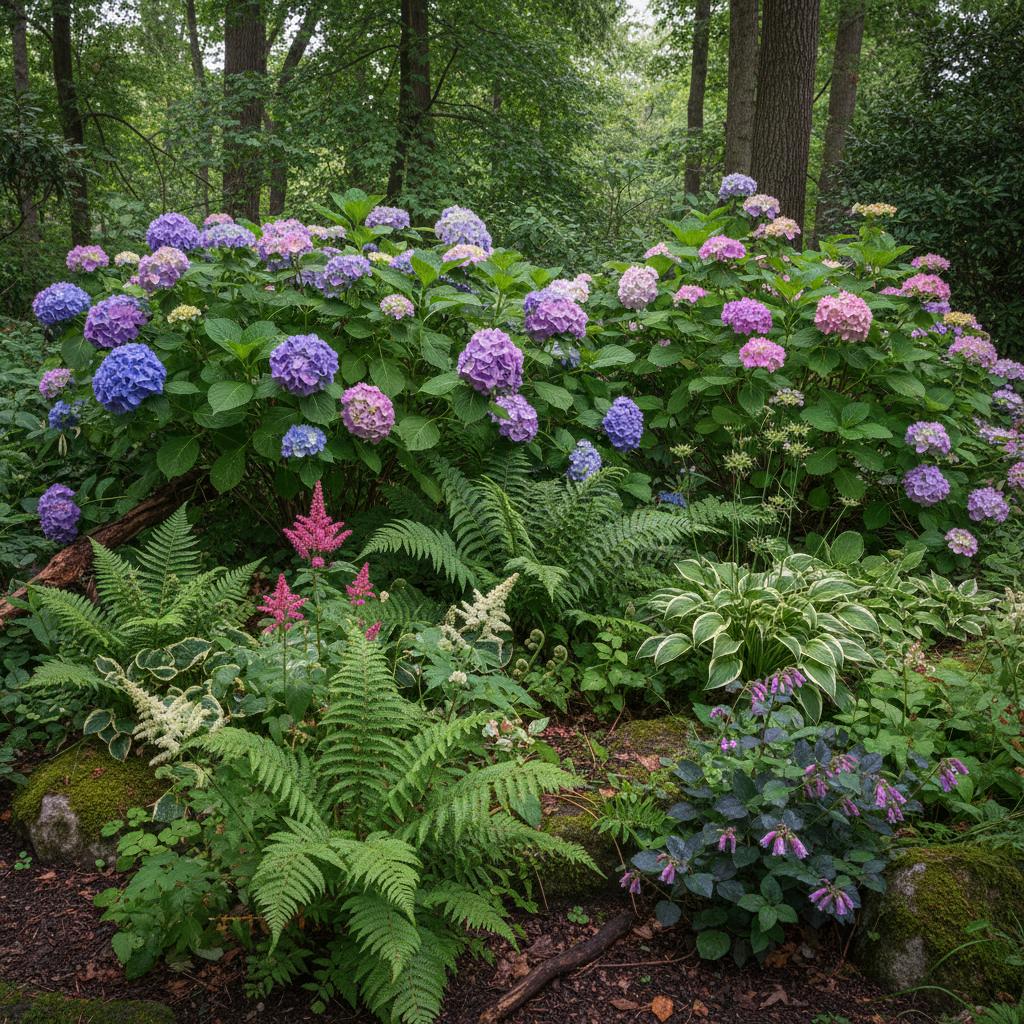 | Hortensja + rododendron + kalina | Kwasowa, żyzna, wilgotna | Barwne kule kwiatów, intensywna zieleń |