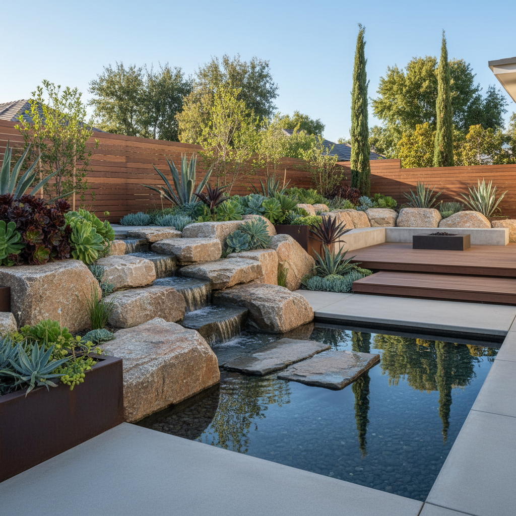- Wykorzystaj elementy wodne – małe oczko wodne lub fontanna podkreślą kamienisty charakter.